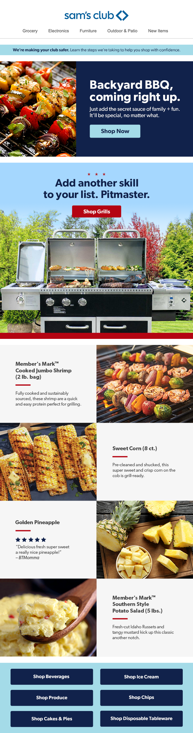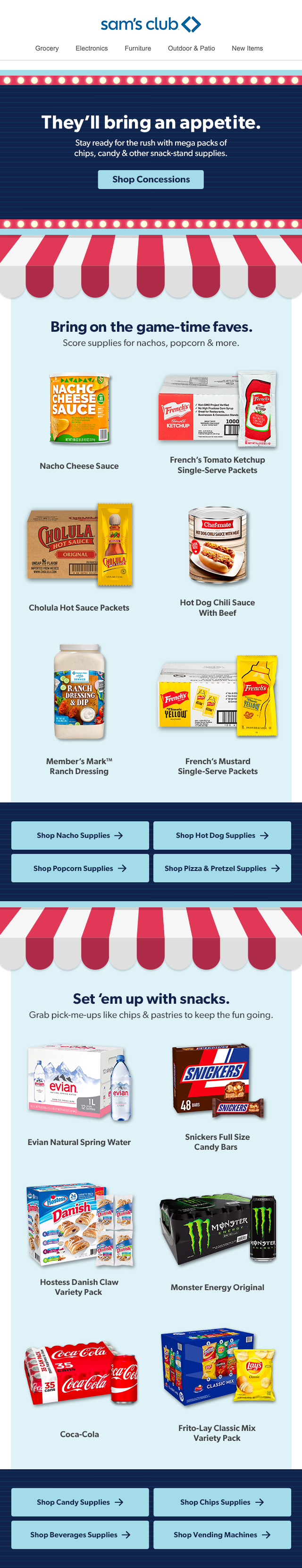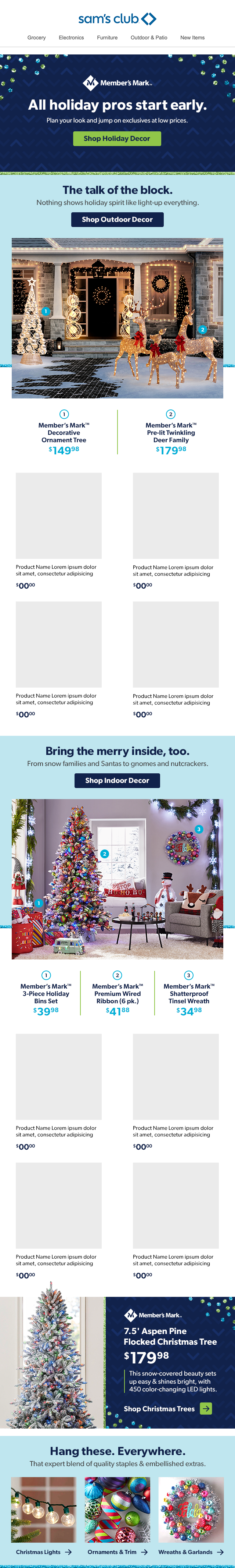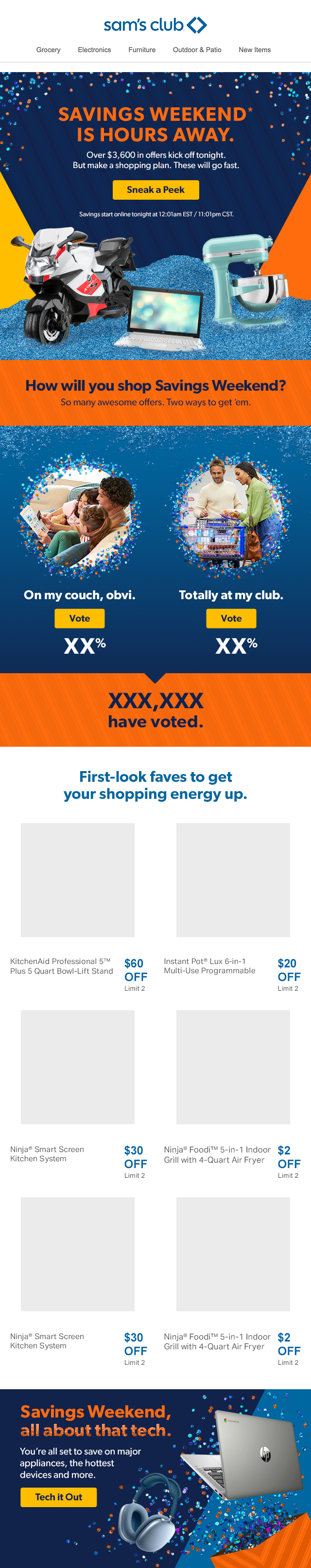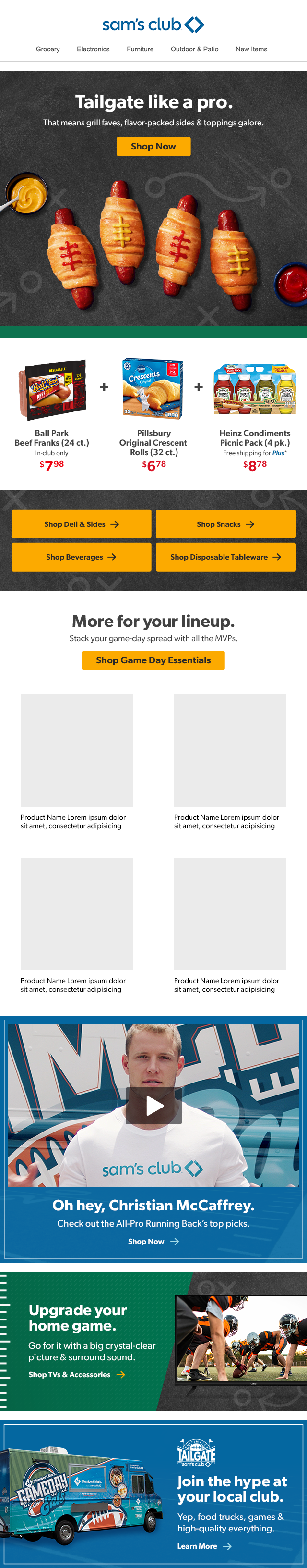 Sam’s Club savings events are often supported with extensive email campaigns that allow customers to preview and shop big events from home. Our emails tend to focus on promoting big-ticket items while also marketing dynamic products based on customers’ browsing history. Designing with the help of an event style guide, we strive to create engaging layouts that allow the event’s look and feel to shine through.